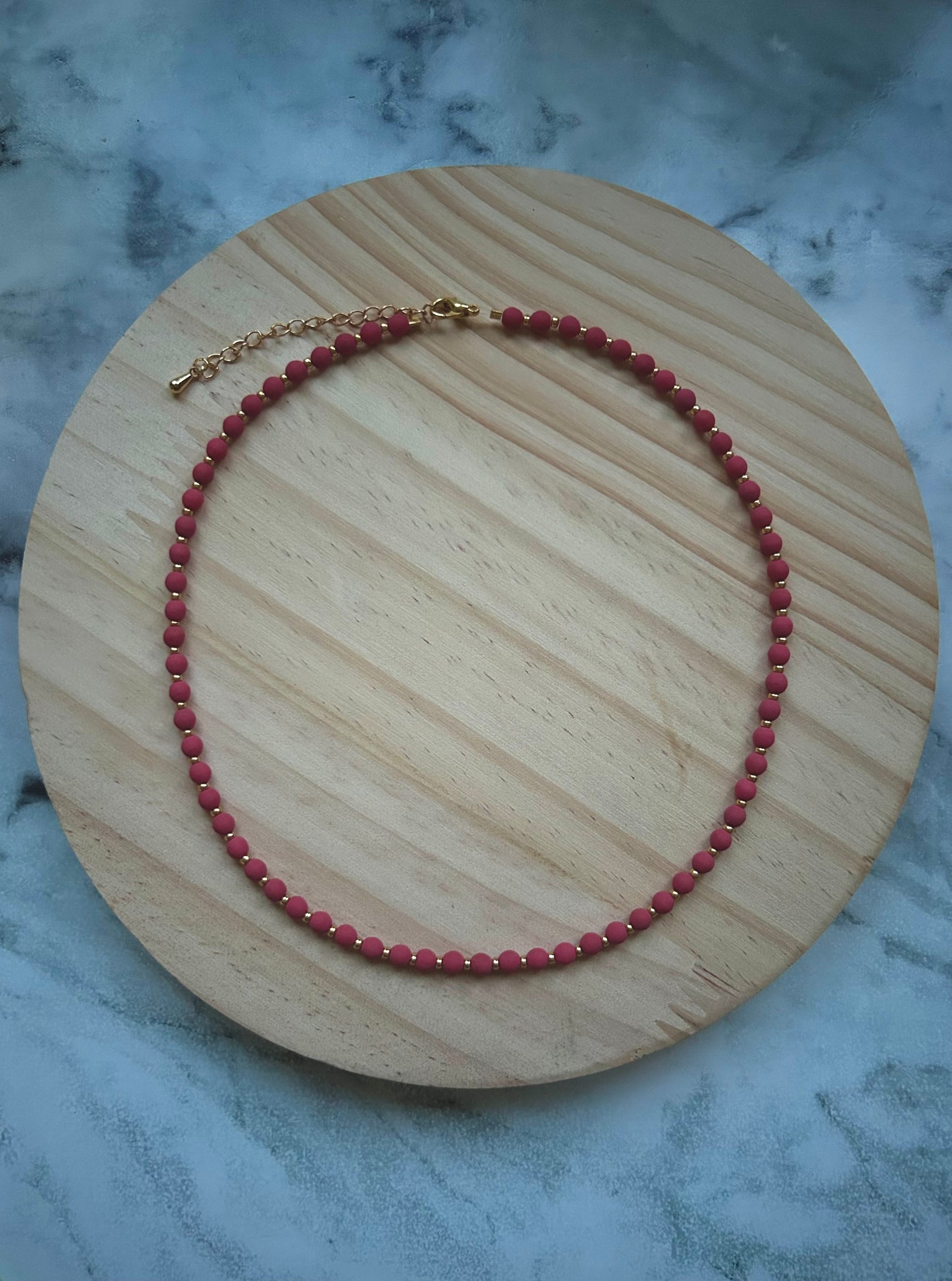 Burgundy and gold plated chunky bead necklace. Made from matte velvet glass beads and measuring 16” at its longest length with a gold plated clasp. A 2” gold plated adjoining extension chain allows this necklace to be worn between 14-16” making it perfect for layering. Burgundy beads measure approximately 4mm each.